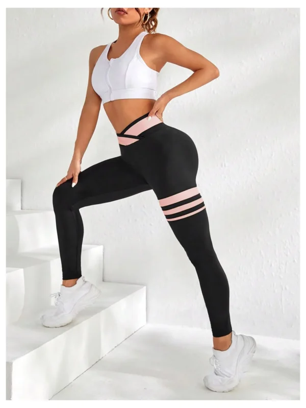 High-stretch fabric, a high-waist design, and a stylish color-block striped print, perfect for jogging, sports, gym, or casual wear, and are easy to care for with machine wash or dry clean options